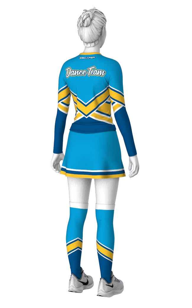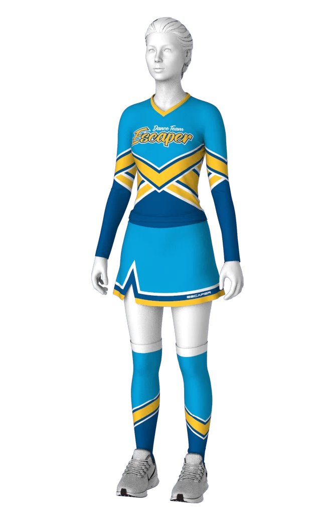 EscaperОписание: Женский комплект черлидера: лонгслив и юбка. Облегающий лонгслив с эластичной V-образной горловиной. Втачной рукав без манжеты. Юбка на подкладке, чуть расклешенная с разрезом спереди. Внутри шортики. Полная сублимация — любой цвет и дизайн (уже входит в стоимость). Возможно дополнить комплект гетрами и бантом.